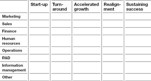 Then you need to focus on critical transitions. Which are the most important transitions going on in your company? Suppose you’re a small, rapidly growing pharmaceutical company. You have just received approval for a promising new drug; you’re hiring a new sales force and need to get up to speed faster than a competitor. Your success in onboarding new salespeople may make the difference between great success and so-so performance. Your initial efforts therefore should focus on helping all those salespeople get up to speed as quickly as possible, as well as helping the sales organization as a whole to gel. Use the Transition Heat Map tool in figure 10-1 to summarize your assessments of which transitions are most critical in your organization.