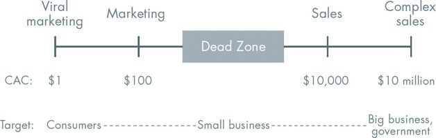 Most sales are not particularly complex: average deal sizes might range between $10,000 and $100,000, and usually the CEO won’t have to do all the selling himself. The challenge here isn’t about how to make any particular sale, but how to establish a process by which a sales team of modest size can move the product to a wide audience.