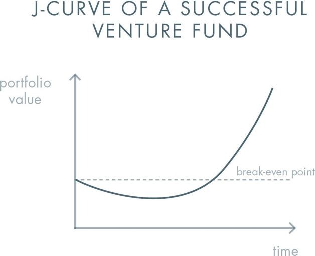 Venture capitalists aim to identify, fund, and profit from promising early-stage companies. They raise money from institutions and wealthy people, pool it into a fund, and invest in technology companies that they believe will become more valuable. If they turn out to be right, they take a cut of the returns—usually 20%. A venture fund makes money when the companies in its portfolio become more valuable and either go public or get bought by larger companies. Venture funds usually have a 10-year lifespan since it takes time for successful companies to grow and “exit.” But most venture-backed companies don’t IPO or get acquired; most fail, usually soon after they start. Due to these early failures, a venture fund typically loses money at first. VCs hope the value of the fund will increase dramatically in a few years’ time, to break-even and beyond, when the successful portfolio companies hit their exponential growth spurts and start to scale.